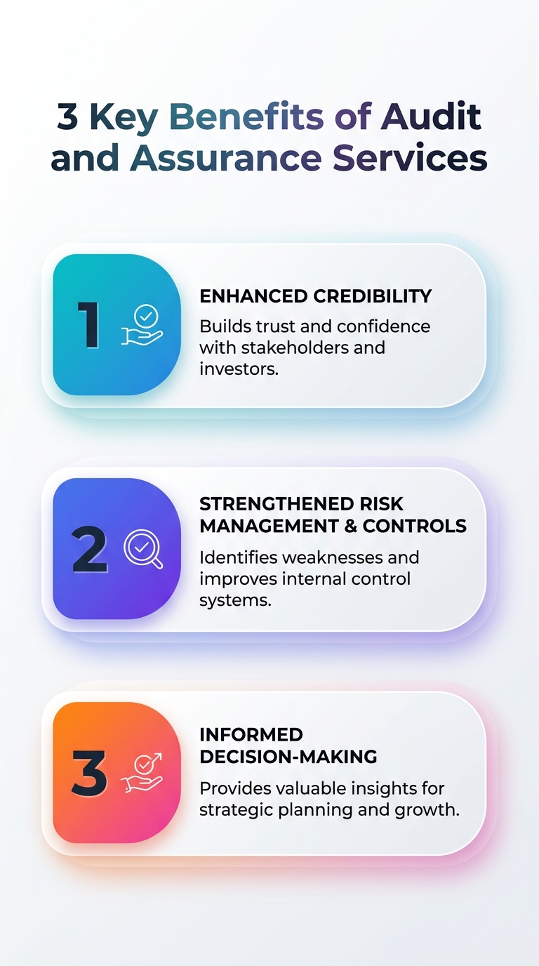 This infographic highlights the three core benefits of audit and assurance services for accounting and professional services firms. It helps readers understand how these services enhance credibility, compliance, and decision-making.